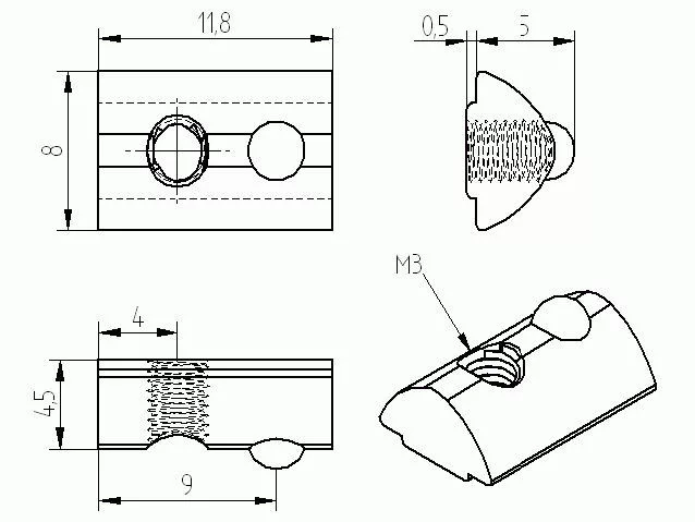 I5 slide nut 12x7,7x4,65 mm, M3 5mm groove