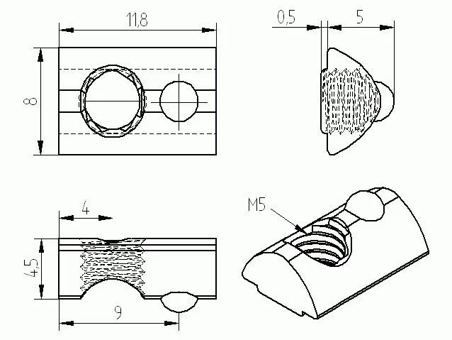 I5 slide nut 12x7,7x4,65 mm, M5 5mm groove